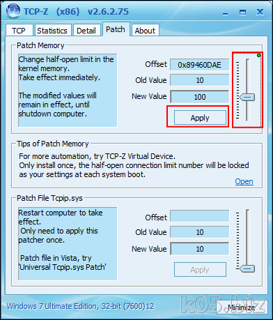tcp-zというソフトを使います。使いかたは簡単で、起動して左の画面のところで100ぐらいにして[Apply]ボタンを押します。これで同時接続数が増えます。設定後は、このソフトを終了させても問題ありません。再起動しない限り有効です。逆にいうと起動時に設定しないと駄目だということですね。まとめ