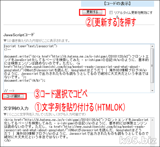 でもせっかくなので、文章自体をJavascript化する手法だけ書いておきます。