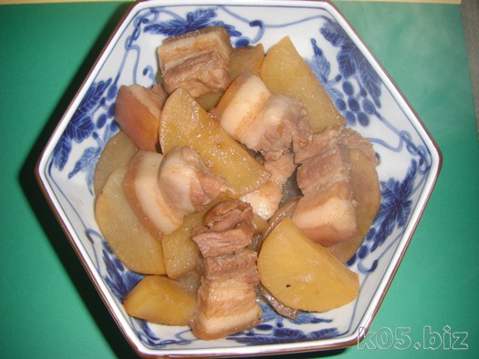 3.水、しょうゆ、砂糖、しょうがをいれ、そこに豚バラブロック、大根入れてひたすら煮込む