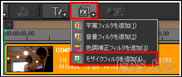 タイムラインで作成してください。真ん中ぐらいにある「FX」と書いているアイコンをクリックするとこの画面のようになります。モザイクフィルタを追加を選択します。