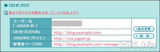管理者ページが、http://blog.example.com/manage となっていますが、http://xxx.jugem.jp/manage でもアクセスできますので、独自ドメインの設定が反映されていないとき、設定がうまくいかない場合などに利用できます。