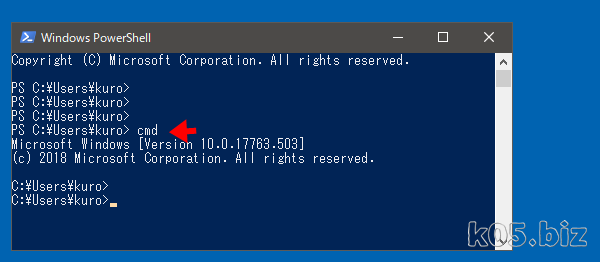 先頭に「PS 」がついてる時は、PowerShellで、ついてないときは、コマンドプロンプトです。