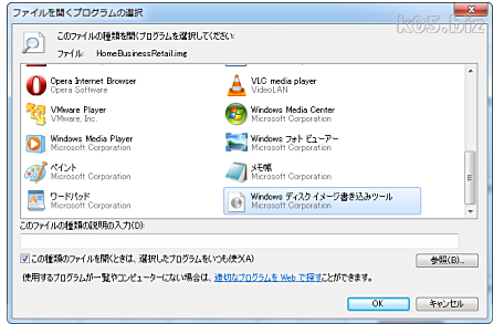 「プログラムから開く」を選択した場合は、一覧に「Windows ディスクイメージ書き込みツール」があればそれを選択。