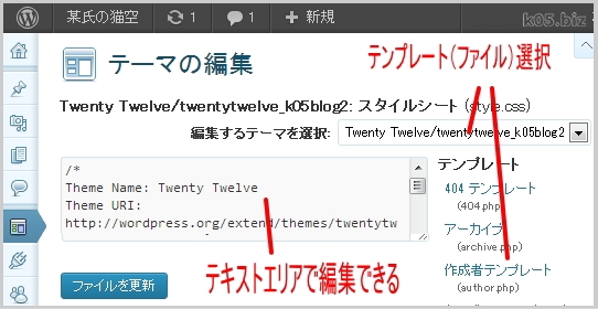 現在使用しているテーマーは、「外観」->「テーマ編集」で編集することが可能です。