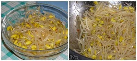 1.豆もやしを水でよく洗って、水を切っておく2.フライパンに、水・豆もやしをいれて、ふたをして沸騰させる