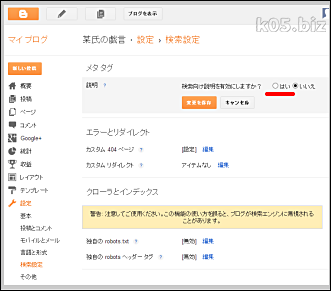 「設定」->「検索設定」のメタタグの説明のところで、「はい」を選択して有効にします。