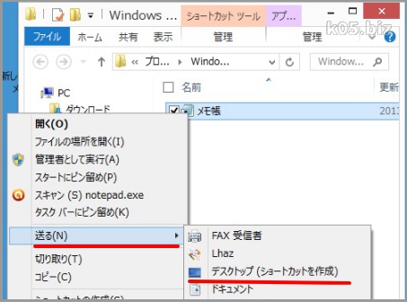 右クリックメニューから、「送る」->「デスクトップ(シュートカットを作成)」を選択
