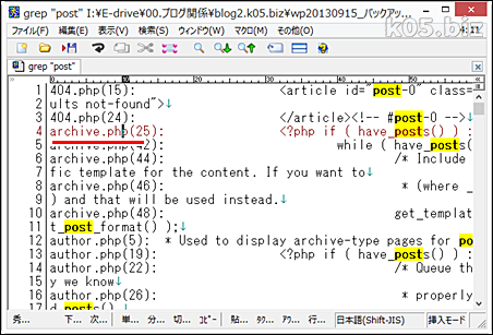 多くのテキストエディタには、grepという機能がついています。複数のテキストファイルの中から、該当するキーワードで検索して見つけ出すというのが容易にできる機能です。