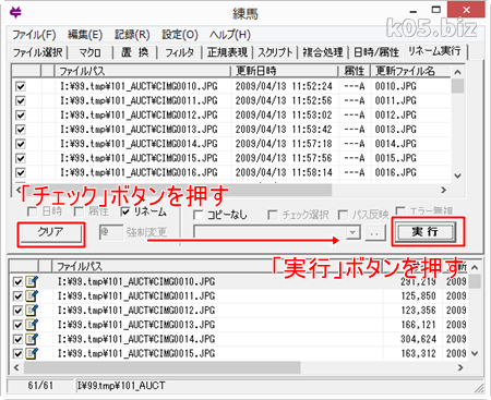 左側の「チェック」ボタンを押して、上の一覧でリネームの実行結果がそれでよいのか確認します。