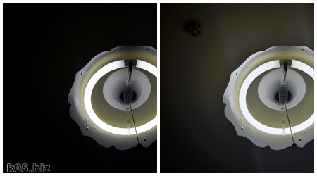 左側が普通の撮影、右側がHDR機能を使いました。左上の火災報知器をみれば違いがわかるかと思います。
