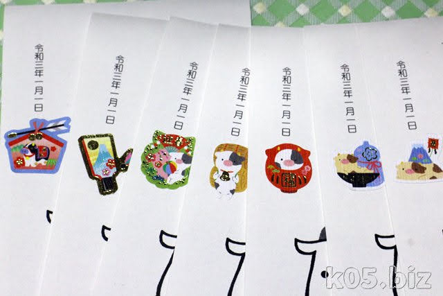 年賀状にも少しだけ彩が欲しいということで、100均年賀シールを貼ってみると意外とそれらしく仕上がりました。