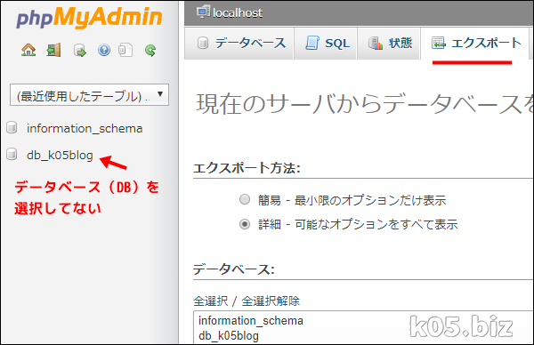 エクスポートするところで、「詳細 - 可能なオプションをすべて表示」をチェックして、データーベースの選択でてくることでも、データベースの選択ができてないのがわかります。