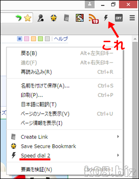 追加したいページを表示して、稲妻みたいなアイコンをクリックすると追加できます。もしくは、右クリックでメニューをだして、Speed Dial 2を選択しても追加できます。