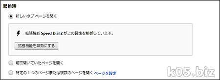 Chromeの設定をみると、上記のような項目があります。初期ページを「Speed Dial 2」にすることで実現しているようですね。