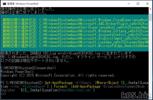 Get-AppXPackage -AllUsers |Where-Object {$_.InstallLocation -like "*SystemApps*"} | Foreach {Add-AppxPackage -DisableDevelopmentMode -Register "$($_.InstallLocation)\AppXManifest.xml"}