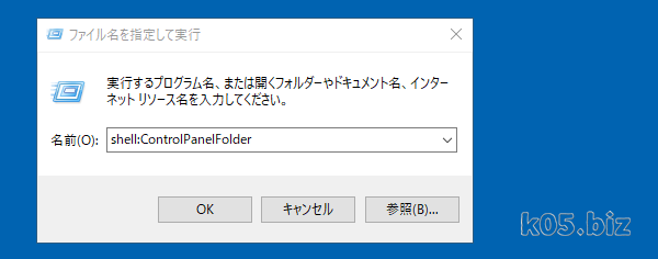 で、コントロールパネルが立ち上がるかと思います。「shell:ControlPanelFolder」を入力するのが微妙な感じですが・・・。「shell:ControlPanelFolder」は大文字小文字の区別はないので、すべて小文字でもOKです。