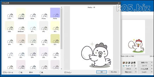 操作は簡単で、フイルム効果を選択して、「グレースケール」にチェックをいれると、それらしいものが出来上がります。印刷したときのイメージに合うような画像をこの中から選べばOKです。