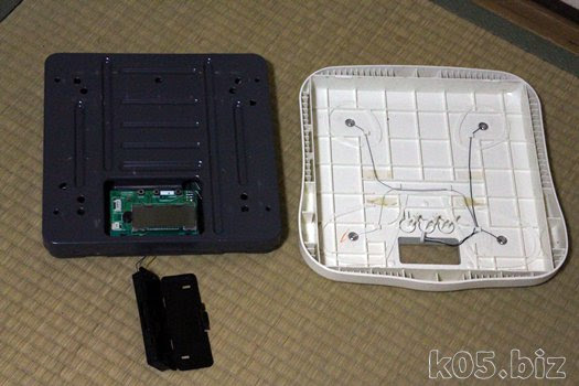 仕方がないので、内部基盤を見てみるしかありません。この体重計は、白い部分がはめ込み式になっていて取り外せるようになっていました。