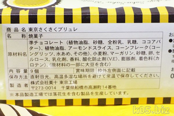 準チョコレート(植物油脂、砂糖、全粉乳、乳糖、ココアバター)、植物油脂、アーモンドスライス、コーンフレーク(コーングリッツ、水あめ、その他)、小麦粉マーガリン、砂糖、卵、セルロース、乳化剤、香料、酸化防止剤(V.E)、膨脹剤着色料(カロテン)、(原材料の一部に大豆を含む)