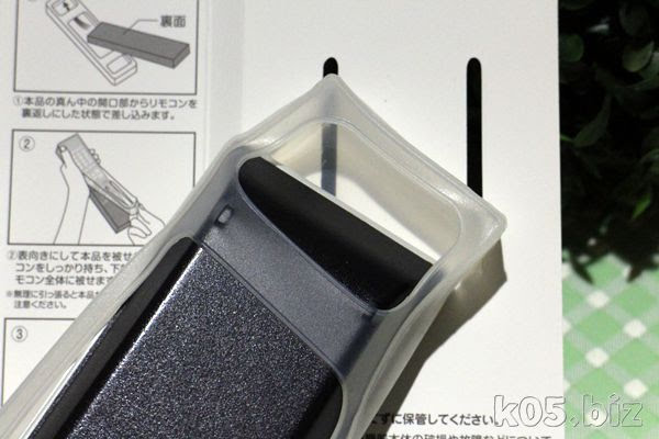 前回と同じように装着します。写真ではそんなに悪く見えませんが、黒いリモコンにこの乳白色のリモコンカバーは個人的には微妙かなぁと思います。実際にはもっと乳白色に見えます。