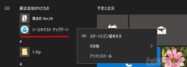個人的には、ソースネクストのメールを購読してるので、アプリによる告知はいらないかなぁと思うので、アンインストールすることにしました。Windows10の場合は、スタートメニューの「ソースネクスト アップデート4.0」を右クリックすると、右クリックメニューが出てくるのでここからアンインストールを選択すると楽だと思います。