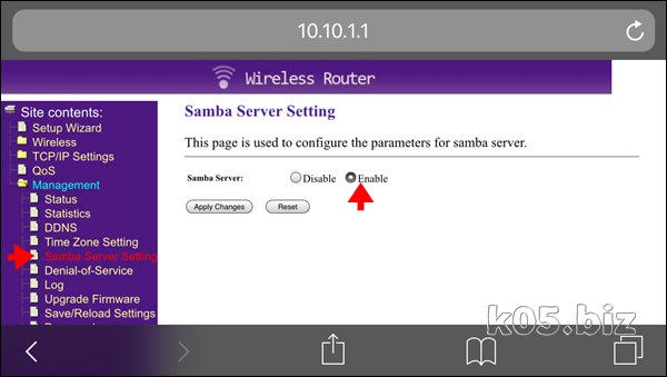 管理画面から、Samba機能を有効化してください。初期状態では、無効になってるようです。