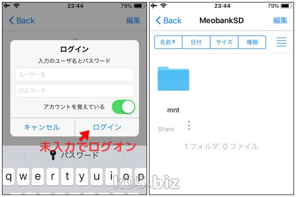 一覧の「MeobankSD」を選択すると、ログイン認証が出てくるので、未入力(匿名)でログインします。そうすると、接続先が表示されます。SDもUSBメモリーも接続してないとこんな感じの表示になります。