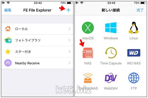 「+」から接続を追加します。NASを選択します(Windowsを選択してもたぶん同じ)。