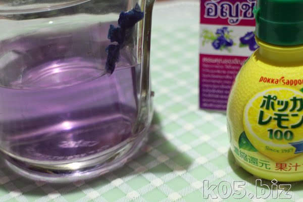 少しレモン汁を垂らすと、パープル(紫)色に変化します。