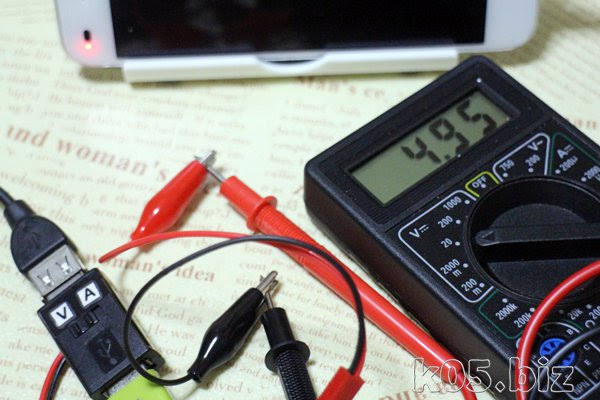 充電してる時(負荷時)の電圧は、こんな感じでした。この充電器、5Vよりも少し低めだと思われる。