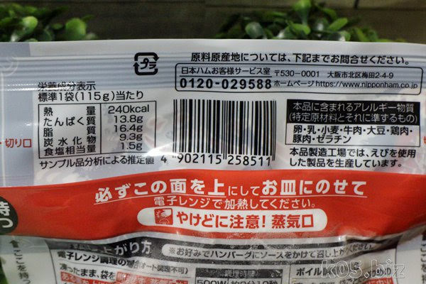 食肉(牛肉、豚肉、鶏肉)、たまねぎ、つなぎ(パン粉、卵白液、卵白末、全卵末)、粒状植物性たん白、植物油、食塩、ぶどう糖、ビーフエキス調味料、ゼラチン、しょう油、砂糖、香辛料、ワイン、牛乳、にんにく/加工デンプン、調味料(アミノ酸等)、カラメル色素、増粘多糖類、(一部に卵・乳成分・小麦・牛肉・大豆・鶏肉・豚肉・ゼラチンを含む)
