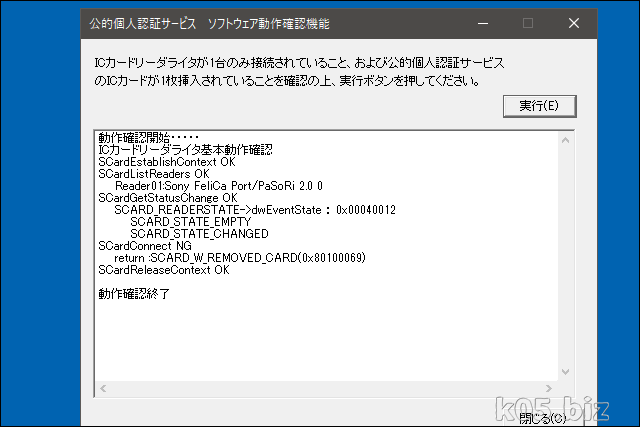 カードリーダーをPCに接続して、マイナンバーカードを置いて、「実行」をクリックしてみてください。ちゃんと動作してるのなら上記のような表示になるかと思います。