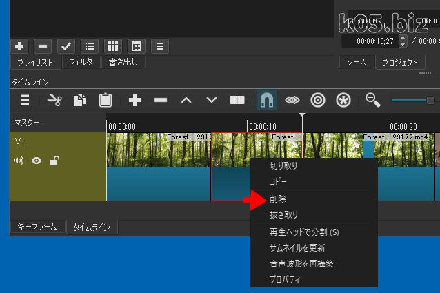 カット(削除)したい動画クリップを右クリック=>削除で削除できます。