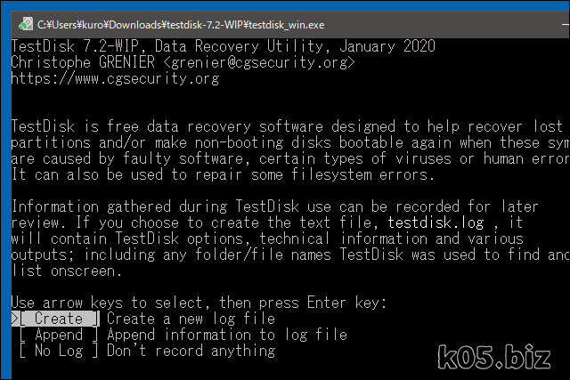 ツールと同じフォルダに「testdisk.log」というログが作成されて、そこに作業ログが書かれます。