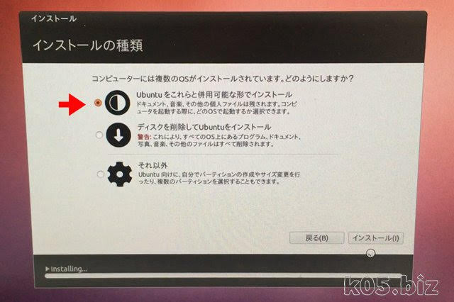 「Ubuntuをこれらと併用可能な形でインストール」を選択。インストールが終了すると再起動です。起動時に option(alt)キーを押すのを忘れずに・・。