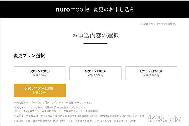 0 SIMのご利用者向けページから、サービス変更します。申し込みが完了すると、このメニューは出てきません。