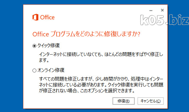 Office2013だとこんな画面になるかと思います。「クイック修復」を選択しました