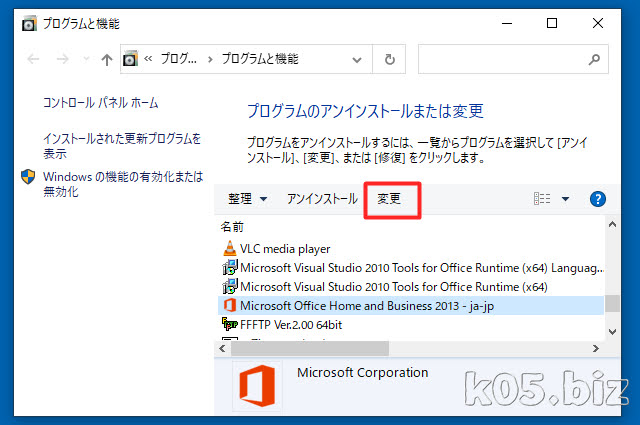 プログラムの追加と削除の一覧から、Officeを選択して「変更」ボタンをクリックします。
