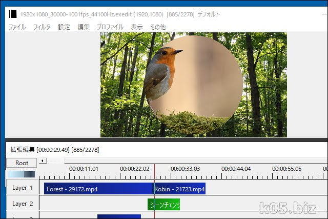 タイムラインのところで、右クリック=>フィルターオブジェクトの追加 => シーンチェンジで、シーンチェンジを挿入。シーンチェンジの設定で、ワイプ(円)を選択。そうすると、場面の切り替え時に、ワイプ(円)の効果を付与することができます。