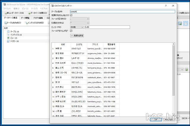 DB Browser for SQLiteをつかって、作成したCSVファイルをインポートして、そこからサンプルDBを作成します。