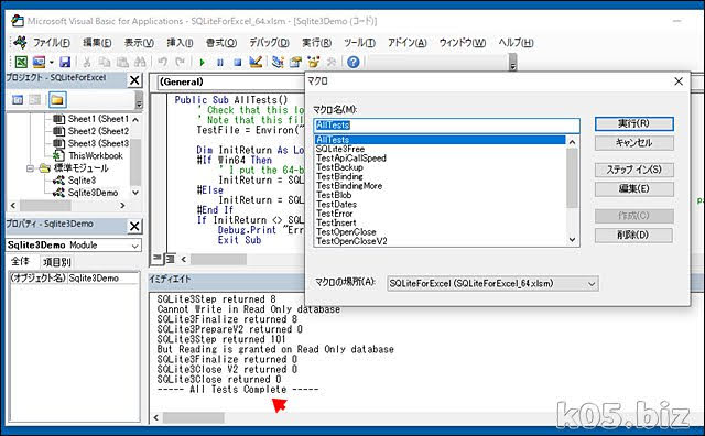 Sqlite3Demo内の「Alltests()」を実行します。イミディエイトウィンドウで、実行結果を確認してください。