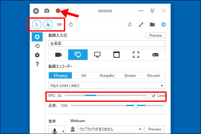 FPS(フレームレート)が初期値は10なので30まで上げます。経験上、15以上ないとアプリの操作動画であっても厳しいと思います。