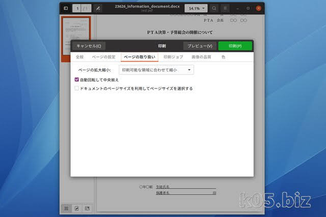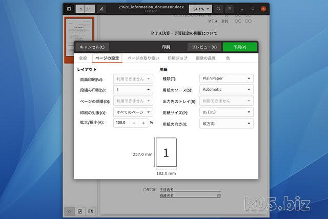 A4文書をA4用紙に印刷するのは、うまくいきました。ただ、A4文書をB5用紙指定で印刷すると、縮小印刷されない感じです。