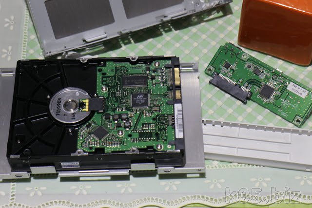 こんな感じで、金属ケースから取り外せます。SATA-USB基板は、SATA端子に差し込んであるだけなので、引き抜けば簡単に外れます