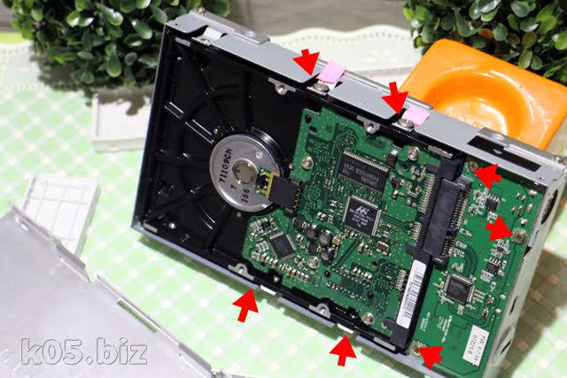 そうすると、HDDが顔を出します。HDDを固定している側面のネジ4本、SATA-USB基板を固定しているネジ3本を取り外します
