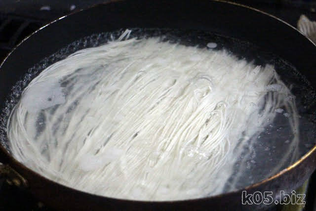フライパンで、ソーメンを茹でる。パッケージに裏に書いてる通りで問題ないと思う。沸騰してから2分半から3分と書いてあった。