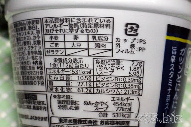 カロリー: 531kcal (めん・かやく 454kcal、スープ 77kcal)