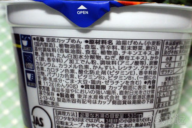 油揚げめん(小麦粉(国内製造)、植物油脂、食塩、香辛料、粉末野菜、卵白)、添付調味料(香味油脂、食塩、植物油、チキンエキス、砂糖、香辛料、たん白加水分解物、ねぎ、酵母エキス)、かやく(卵、香辛料)/加工でん粉、調味料(アミノ酸等)、炭酸カルシウム、カラメル色素、かんすい、レシチン、クチナシ色素、カロチン色素、酸化防止剤(ビタミンE)、香辛料抽出物、パプリカ色素、ビタミンB2、ビタミンB1、(一部に小麦・卵・乳成分・ごま・大豆・鶏肉・ゼラチンを含む)